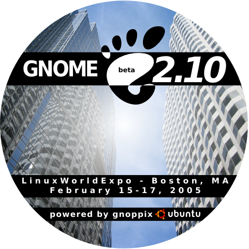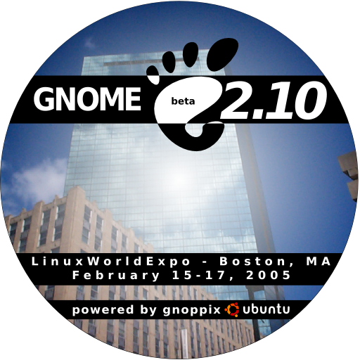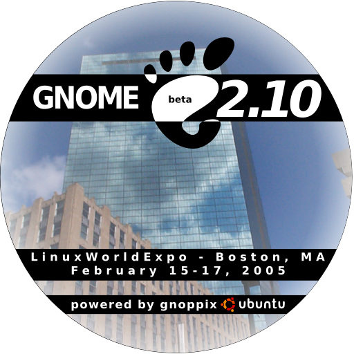 - LinuxWorldExpo GNOME CD Label 1 - Outside to inside, white to transparent gradient. The only one like this, since I think I like it the other way better. Trivial change, piece of cake to change any of the others in a matter of moments/minutes.